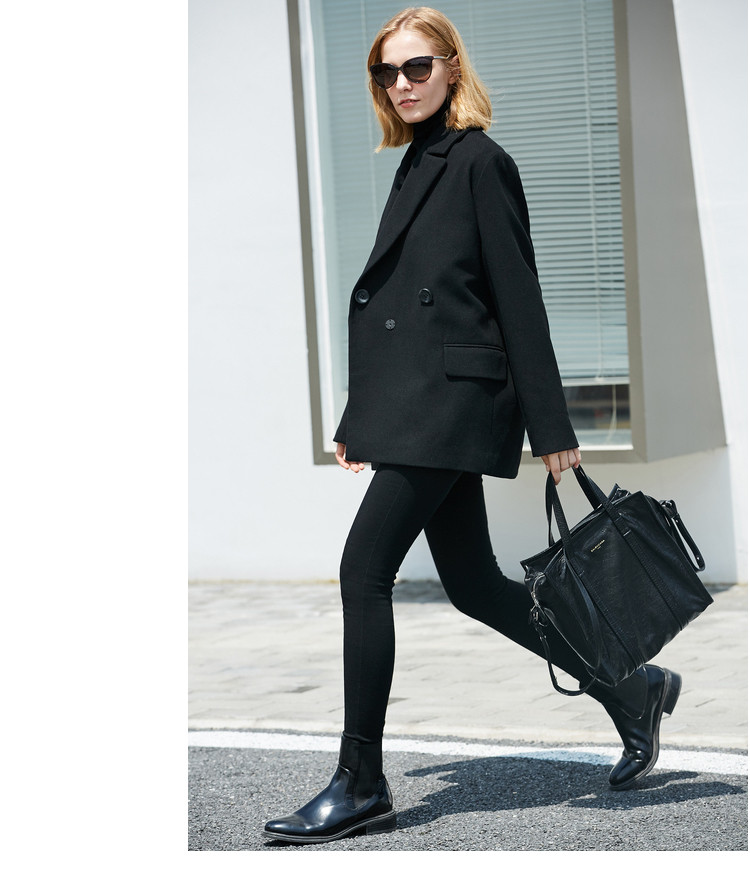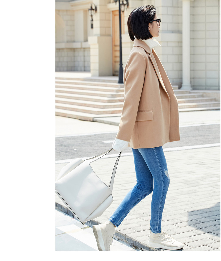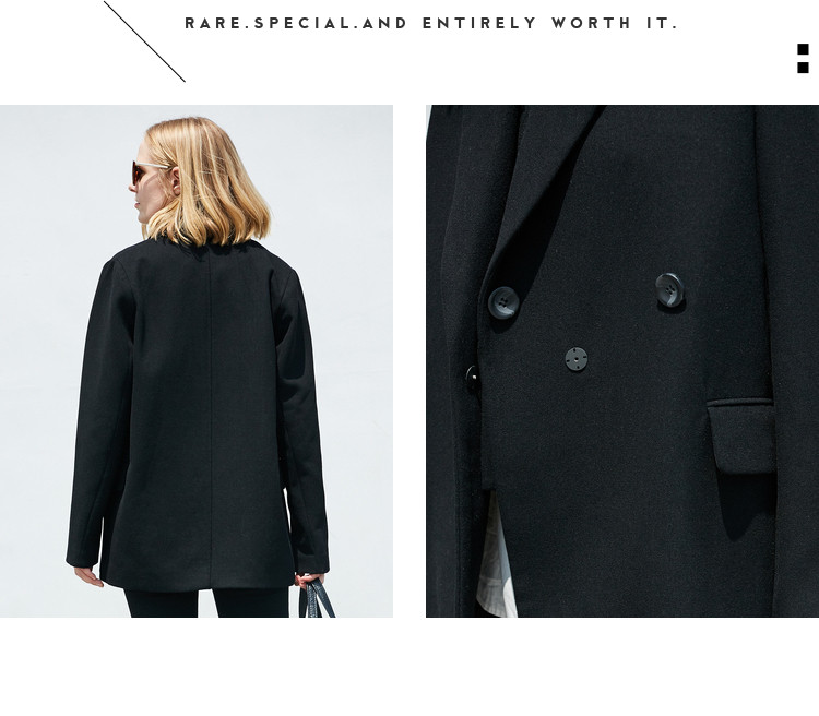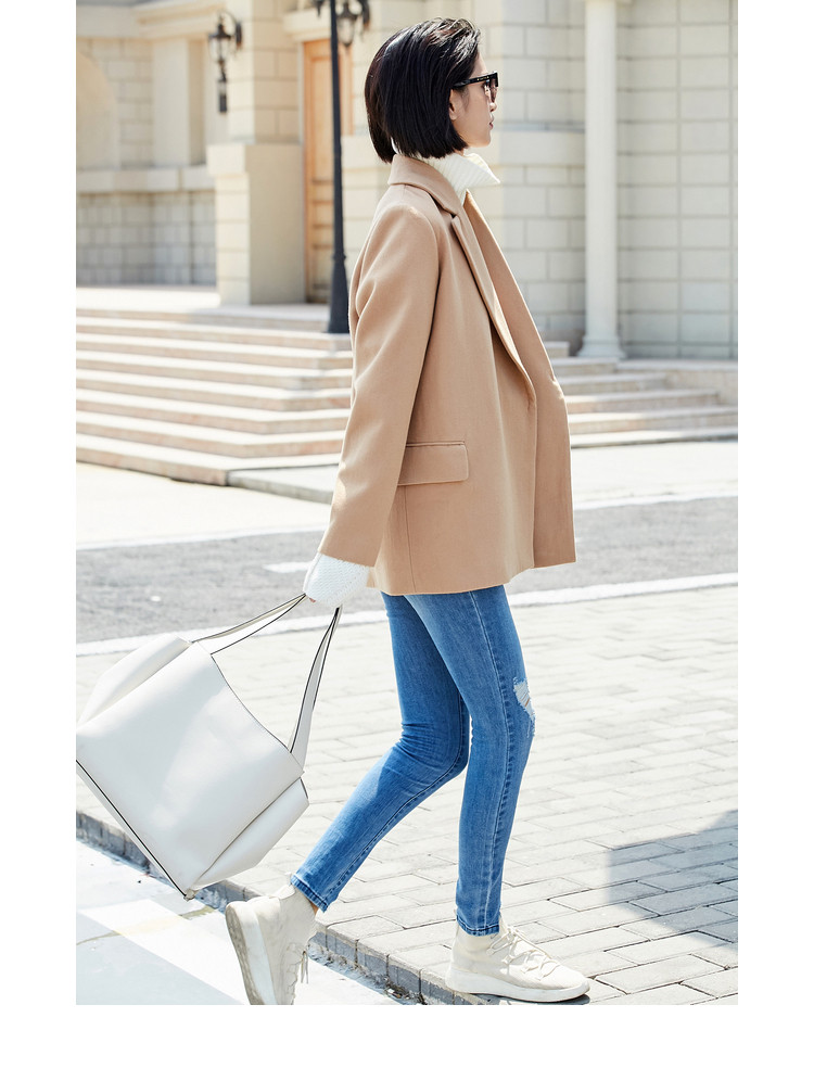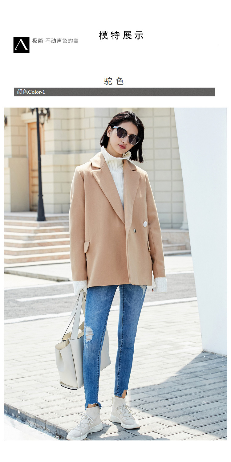 | 面料成分: | 驼色:面料:52%聚酯纤维 48%羊毛 里料:100%聚酯纤维 黑色:面料:51.1%聚酯纤维 48.9%羊毛(含微量其他纤维) 里料:100%聚酯纤维 |