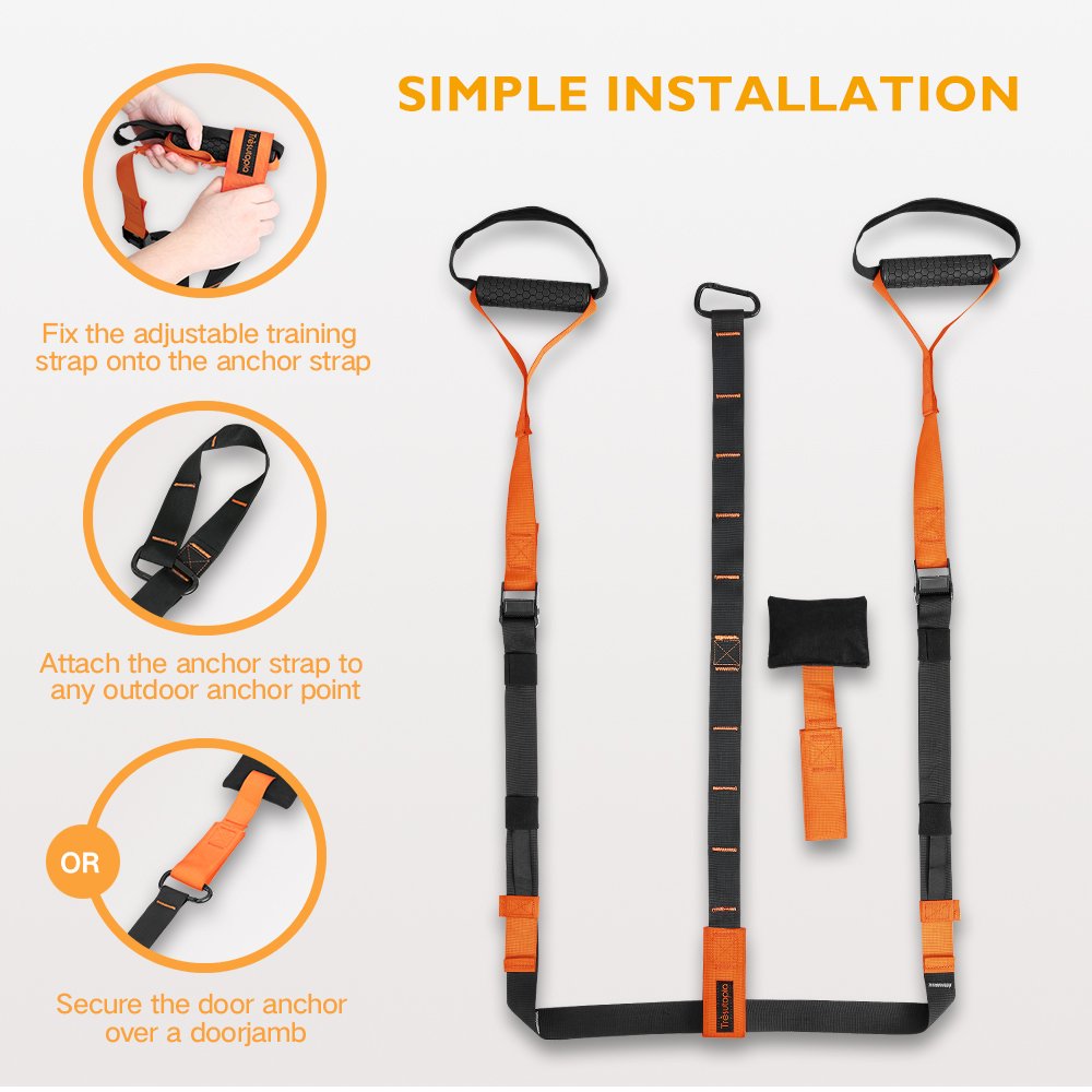 This hanging type training equipment has been designed with excellent durability and detachability by using fabric material strap, ABS resin handle, metal buckle.