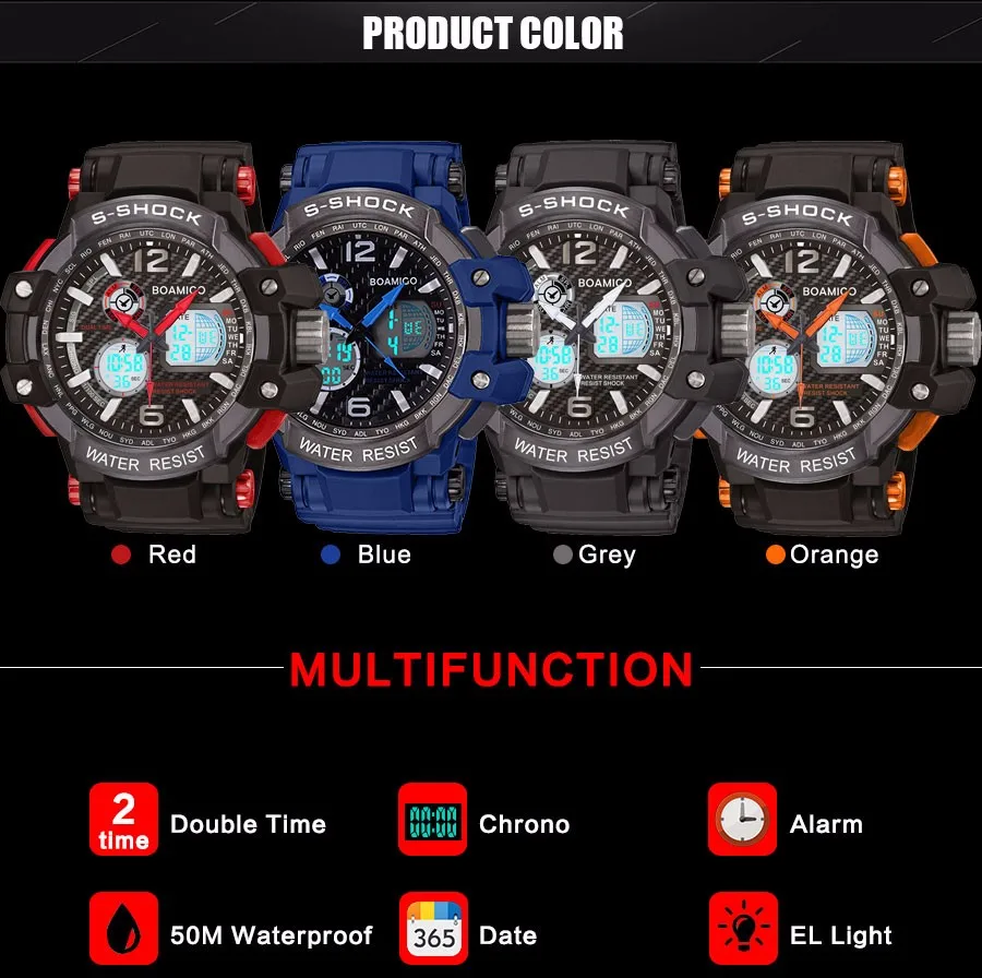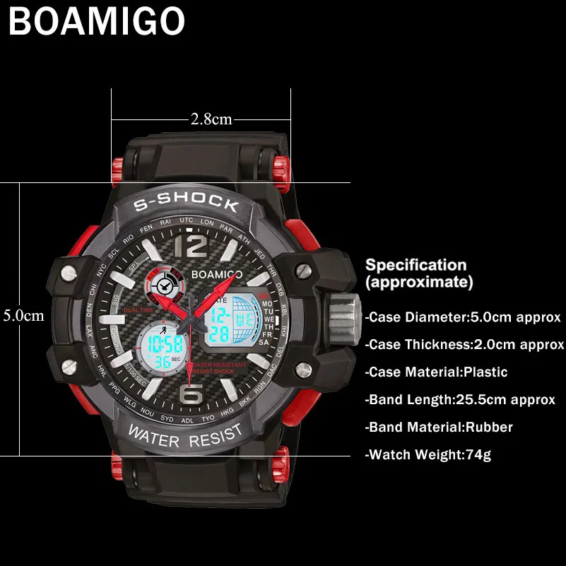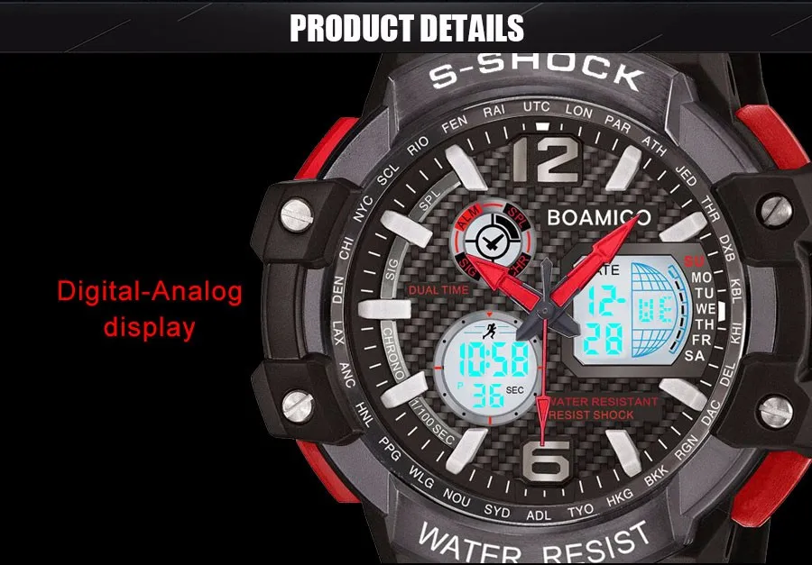 Feature:Alarm,Water Resistant,Complete Calendar,Multiple Time Zone,Chronograph,Auto Date,LED display