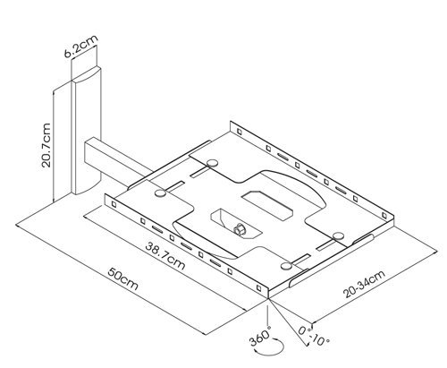 - Feature : The demension of the bottom plate is 15.2" L x 7.9" - 13.4" W. / The width of the bottom plate easily adjustable (7.9" - 13.4") / The bottom plate can turn 360 degree. It also can be tilted up to 10 degree. / Loading capacity: 33 lb. Color: Silver / Very easy to install: After fix the mount on the wall, then just tie the projector on to the bottom plate with the length adjustable belt.