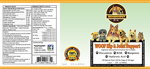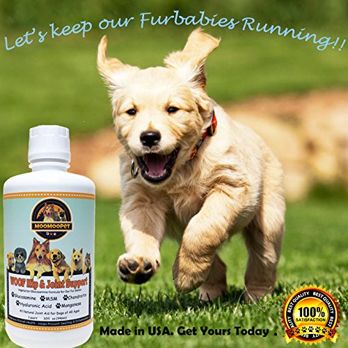 Is your DOG Suffering from Joint Pain after surgery or aging like arthritis? It's difficult to see your dog starts slowing down as he/she grows older! Your furbaby is going to have stronger Hip & Joint health when he/she grows, or less discomfort, less pain, increased flexibility, mobility and better overall health when they start experiencing the aging's symptoms with MooMooPet's WOOF HIP & JOINT SUPPORT. It has been recommended for dogs of all ages, sizes, breeds and activity levels! HIGHLY RECOMMENDED MooMooPet's WOOF HIP & JOINT SUPPPORT Formula contains 1600 mg of Glucosamine Hcl, 1200 mg of Chondroitin Sulfate and 1000 mg of MSM, these are natural active ingredients not only help promote the health of joints and connective tissues, but also supporting general good health. BETTER & FASTER RESULT Liquid joint supplements for dogs have been widely used, and studies have proven that liquid supplements absorb quickly and more efficiently than pills, tablets and chews. EASY TO USE Since our liquid formula makes it easy to feed to any sized dogs, all you need to do it mixing it into their food, no more breaking pills, or worry about they don't like the taste or wonder if they swallow or not. 100% SAFE AND ALL NATURAL MooMooPet's WOOF HIP & JOINT SUPPORT for dogs is 100% PURE, SAFE and BENEFICIAL! Our products are made in USA, manufactured in an FDA and cGMP (Good Manufacturing Practices) certified facility. Also, our products are 3rd party tested, and we are NSF and NASC (National Animal Supplement Council) certified to assure that our products go ABOVE AND BEYOND what the standards are required! 100% SATISFACTION GUARANTEE We only use the very best ingredients available, your furbaby will love it, and feel great and that's our guarantee. TRY IT NOW RISK FREE.Feature