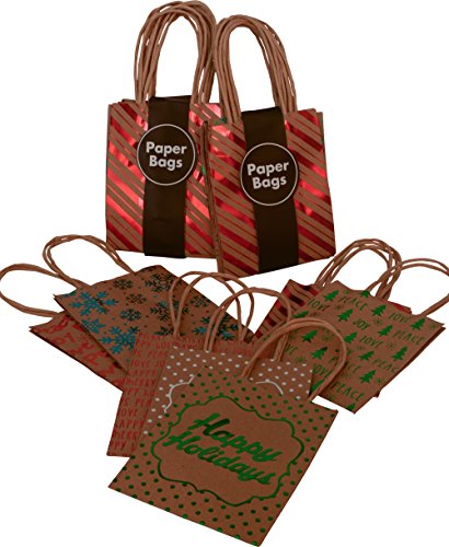Kraft Holiday Gift Bags, foil hot-stamp designs, 24 Small bags in assorted Christmas prints