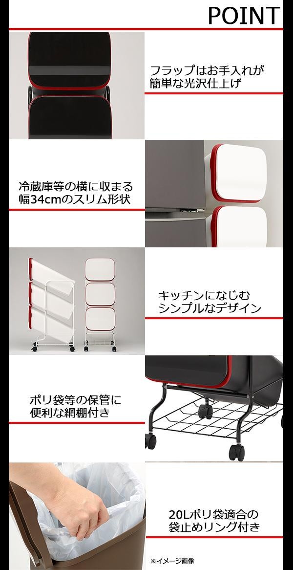 | 冷蔵庫等の横に収まる幅34cmのスリム形状で、キッチンになじむシンプルなデザインのダストボックスです。棚の下部にはポリ袋等の保管に便利な網棚が付いています。フラップ部分は、お手入れが簡単な光沢仕上げです。前輪キャスターにはストッパーも付いています。 |