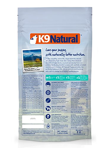 -. Feature : Love your puppy, with naturally better nutrition. K9 Natural Puppy contains only the best blends of nature. / Contains DHA & EPA - supporting healthy brain and eye development / Guaranteed levels of calcium and phosphorus in every bag that supports a puppy's strong teeth and bone development and premium quality protein for healthy muscle growth / Free from grain, gluten, GMO ingredients, corn, soy, dairy, rice, cereals, potato or other gelling agents or fillers / All the essential nutrients your puppy needs to thrive