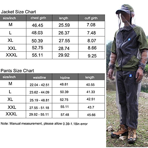 -. Feature : Material: features a fine No-See-Um mesh made from 100% polyester / Design: elasticized waist and cuffs, zippered at the neck for easy access to the face / Lightweight and cool, a little stiffness so that it can keep the shape to eliminate annoying bugs / Equiped with jacket, mitts, and pants, a perfect protection system for your outdoor activities. / Fit for unisex, size pls check picture. In case your size between two sizes, go with the larger size for loose fit and better effect