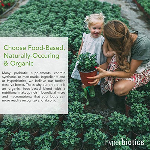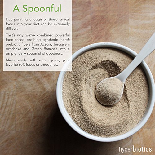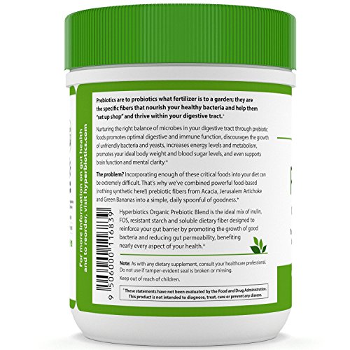 -. Feature : NOURISH YOUR GUT BACTERIA. Prebiotics are to probiotics what fertilizer is to a garden: they are the specific fibers that nourish your healthy bacteria and help them "set up shop" and thrive within your digestive tract. The problem? Incorporating enough of these critical foods into your diet can be extremely difficult. That's why we've combined these powerful food-based (nothing synthetic here!) prebiotic fibers into a simple daily spoonful of goodness. / LOOK AND FEEL YOUR BEST. In the last 10 years, scientists have uncovered the importance of our microbial health for our overall health. We now know that nurturing the right balance of microbes in your digestive tract through prebiotic foods promotes optimal digestive and immune function, promotes healthy weight loss and metabolism, discourages the growth of unfriendly bacteria and yeasts, and supports energy levels, brain function and mental clarity. / REINFORCE YOUR GUT BARRIER. There are two critical factors in your digestive and overall health - the balance of your gut bacteria and the composition of your your intestinal wall - and together these make up your gut barrier. The food-based ingredients in this complete prebiotic complex have been clinically shown to reinforce your gut barrier by encouraging the growth of beneficial bacteria and reducing gut permeability. / AVOID STOMACH UPSET. Hyperbiotics Prebiotic is a proP.R.Ietary blend that is designed with sensitive stomachs in mind. Acacia Fiber actually slows fermentation and reduces gas and bloating. What's more, this complete prebiotic complex is an ideal mix of inulin, FOS, resistant starch and soluble dietary fiber that gently nourishes your gut and promotes the growth of your good bacteria, benefitting nearly every aspect of your health. / CHOOSE FOOD-BASED NATURALLY-OCCURING & ORGANIC. Many prebiotic supplements contain synthetic, or man-made, ingredients and at Hyperbiotics, we believe our bodies deserve better. That's why our prebiotic is an organic, food-based blend with a nutritional makeup rich in beneficial micro and macronutrients that your body can more readily recognize and absorb.