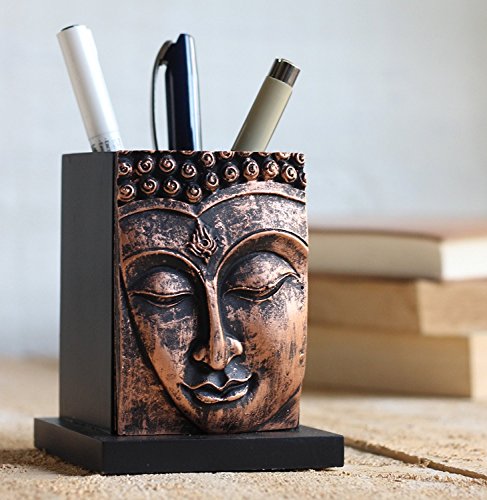 Buddha Pen Pencil Holder stand Wood Design for Desk, Office, and Home decor (bronze)