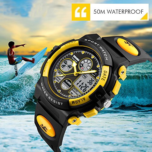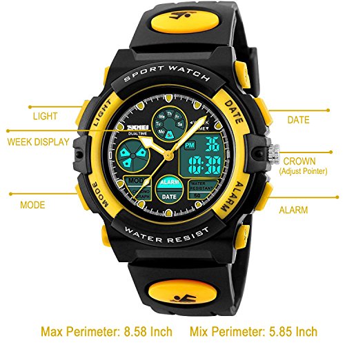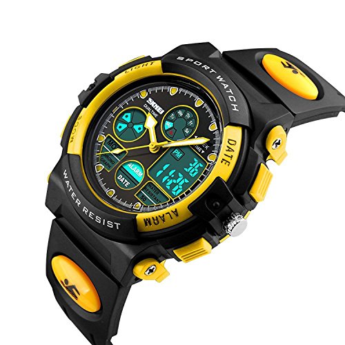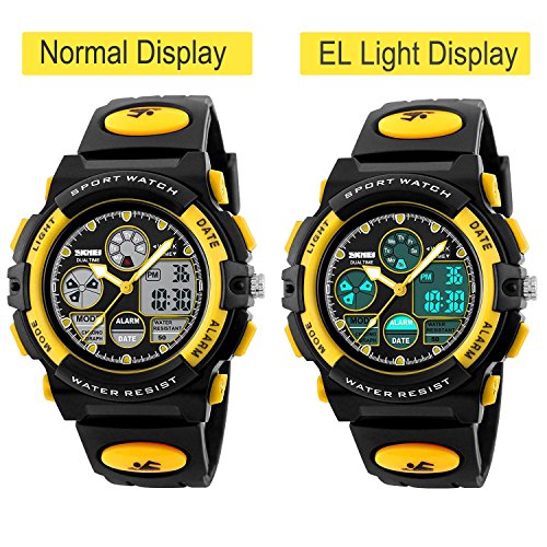 -. Title : Kids Unusual Analog Quartz Dual Time Zone Digital Outdoor Sport Waterproof PU Resin Band Watch with Alarm, Chronograph, EL Back Light, Classic Design Calendar Date Window, for Boys Girls - Yellow