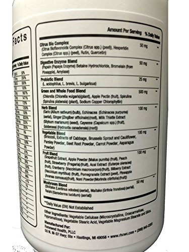 -. Feature : Contains whole food based nutrients covering all components of ideal nutrition / Includes all essential Vitamins, Minerals, Enzymes, Probiotics, Omega's, Greens & Whole Food Blend, Herbs, Vegetable Blend, Fruit & Mushroom Blend, all for a well-balanced dietary supplement / Provides essential nutrients where diet is lacking
