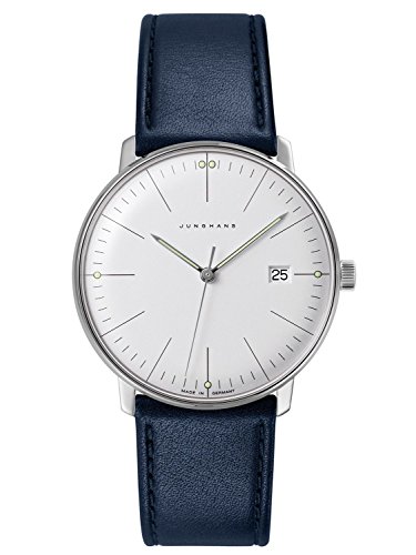 Edelstahlgehäuse, verschraubter Gehäuseboden, Plexi-Hartglas mit SICRALAN-Beschichtung, spritzwassergeschützt, Durchmesser 38 mm, Höhe 10,4 mm, dunkelblaues Kalbslederband, Edelstahl-Dornschließe, Quarzwerk J645.33, silberfarbenes Zifferblatt, Datum, polierte Zeiger, feine schwarze Zahlen und Indizes, Leuchtzeiger und MarkierungenFeature