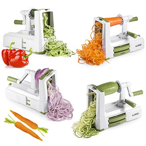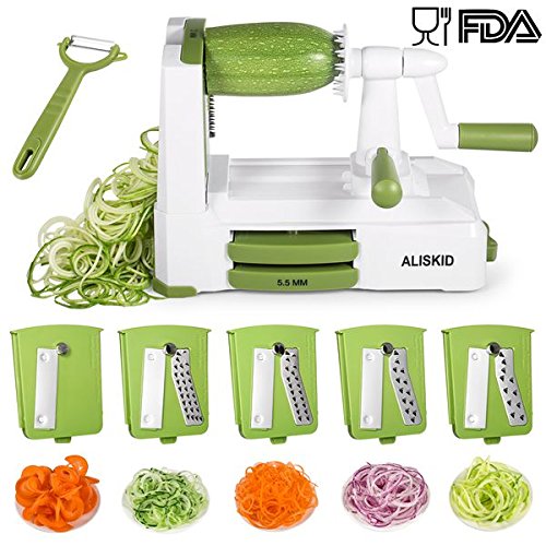 Studio : ALISKID Publisher : ALISKID Product Description BRAND: ALISKID NAME : Vegetable Spiralizer with 5 Blades 5 Blade Specification : [ Ultra Sharp Blades ] Flat Blade 2MM Blade 3MM Blade 5MM Blade 5.5MM Blade 5-Blade Spiralizer Product Feature : 1. BLADES: The 5 Blades are Made of 420-Food Grade High Quality Hardened Stainless Steel 2. PLASTIC BODY: Made of 100% BPA-Free Food Grade Durable Reinforced ABS Material without Smell or Broken Parts 3. POWERFULL SUCTION PAD: Once Locked, It will Stay Firmly Secured to the Countertop for Long Time 4. Strongest and Heaviest Duty Vegetable Spiral Slicer with Powerful Suction Base 5. Toppest Quality Amazing Fashionable Vegetable Spiralizer with 5 Ultra Sharp Blades 6. Perfect for Making Quick Low Carb, Paleo, Gluten-Free Meals,Veggie Pasta Spaghetti, Healthy Veggie Noodles from Firm Fruits/Veggies Like Apple, Onion, Carrot, Zucchini, Cucumber, Cabbage, Beet, Turnip, Rutabaga, Radish, Potato, Sweet Potato, Squash More