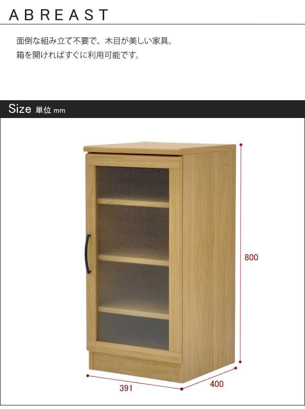 ナチュラルテイストでおしゃれな家具です。完成品なので、届いてすぐに利用できます。 製造国:タイ 素材・材質:MDF、パーティクルボード、透明ガラス 商品サイズ:W391×D400×H800mm(取っ手含まず) 重量:14500g 仕様:完成品耐荷重:天板15kg、棚板1枚あたり5kg棚板3枚可動式(32mmピッチ) ※サプライヤー直送品 ご注文後2~3営業日後の出荷となります【商品名】ABREAST アブレスト キャビネット40 ABR-401CN ナチュラル