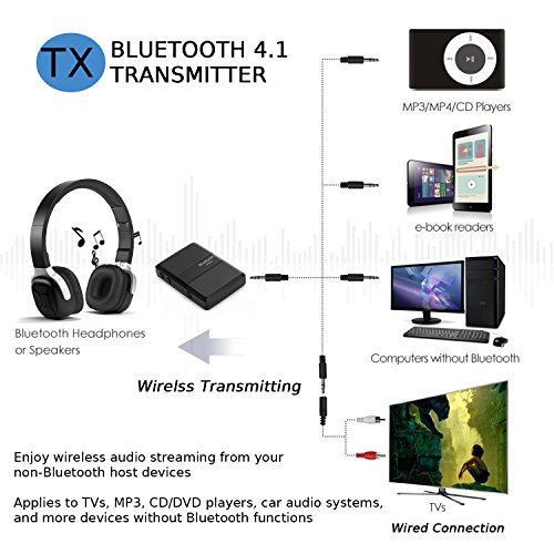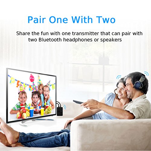2 DEVICES SIMULTANEOUSLY: 2-in-1 Bluetooth V4.1 transmitter can be paired with two Bluetooth receivers (like headphones + speakers) simultaneously. Note: aptX does NOT support Dual Link mode.
