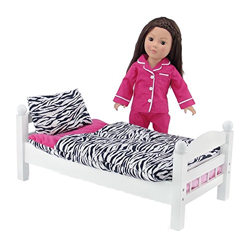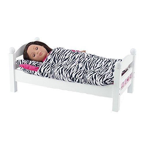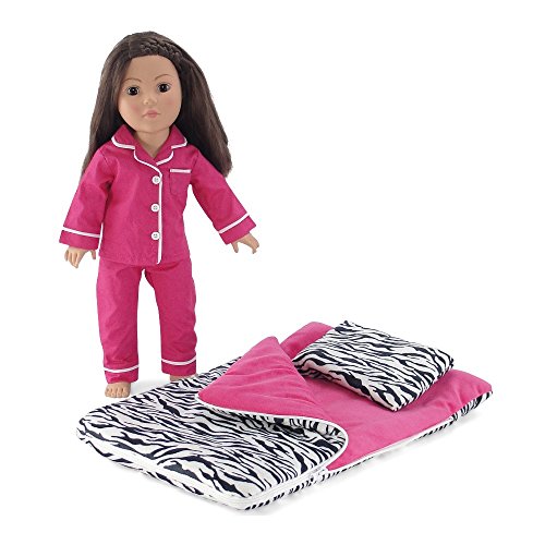 Overnight party this weekend? Your 18 inch doll will be ready to go with this plush and colorful zebra print sleeping bag set! This amazing super-comfy bedding set includes a super thick sleeping bag with soft zebra print fabric on the outside and plush bright pink on the inside, a large zebra print pillow and a matching zippered carry case. Your 18" doll will be the hit of the sleeping party! *Doll Not Included* *Bed Not Included*Feature