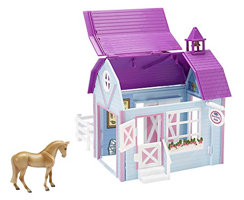 The ultimate barn for the Horse Crazy girl! This beautifully decorated barn features an attached paddock, working doors that open and close, roof section that flips open for easy access to the interior and 2 cavalettis and an easel. Be sure to collect all of the other Horse Crazy Stablemates to have the most colorful barn in town!