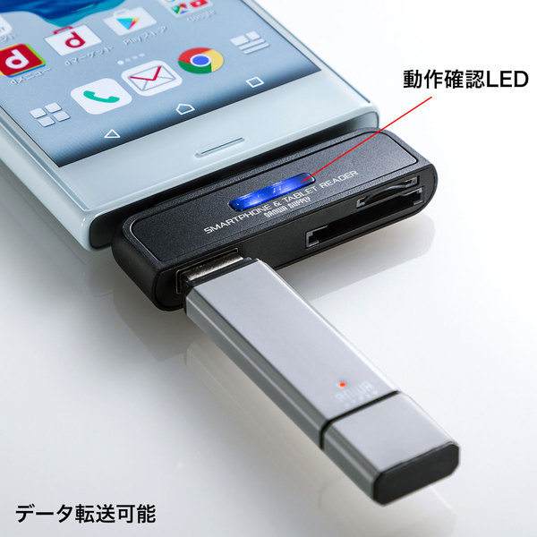 ●スマートフォンやタブレットPCのUSBホスト機能に対応したカードリーダーです。*USBホスト機能に対応していないものには対応していません。