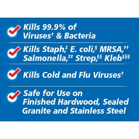 -. Feature : Value pack contains four 75 count canisters of disinfecting wipes in 3 scents: 2 Citrus Blend, 1 Fresh Scent, 1 Orange Fusion / Kills 99.999% of bacteria, including Human Coronavirus and Influenza A2 Virus / Kills cold and flu viruses, E. Coli, MRSA, Salmonella, Staph, and Strep / Remove more than 99% of allergens like car and dog dander, dust mite debris, and pollen / Clear drying formula powers through grease, soap scum and grime