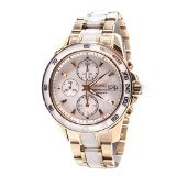 Gold-tone stainless steel case with a gold-tone stainless steel bracelet with white ceramic center links. Fixed gold-tone bezel with white ceramic inlay with tachymeter markings. Mother of pearl dial with luminous gold-tone hands and index hour markers. Minute markers around the outer rim. Dial Type: Analog. Luminescent hands. Date display at the 3 o'clock position. Chronograph - three sub-dials displaying: 60 second, dual 12 hour / 60 minute and 1/10th of a second. Quartz movement. Scratch resistant sapphire crystal. Solid case back. Case diameter: 38 mm. Case thickness: 10 mm. Round case shape. Band width: 17 mm. Fold over clasp with double push-button safety release. Water resistant at 100 meters / 330 feet. Functions: chronograph, tachymeter, date, hour, minute, second. Casual watch style. Seiko Sportura Chronograph Mother of Pearl Dial Gold-tone and White Ceramic 38 mm Watch SNDX02P1.Feature