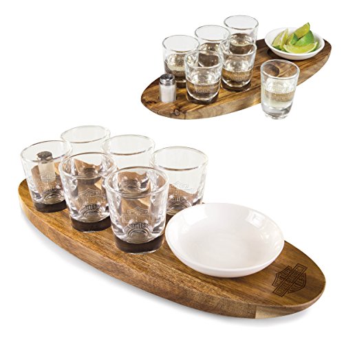 ReleaseDate : 2017-03-21 Studio : Picnic Time Publisher : Picnic Time Binding : Kitchen Product Description The Picnic Time Harley-Davidson Centenaro shot server set features a stunning and durable acacia wood tray that is designed with special individual indented sections that house and stabilize the six shot glasses, plus a 4-inch ceramic dish for garnishes such as lime slices, and a salt shaker. The shot glasses that are included feature weighted shams and give their bases that thick look of luxury, while the salt shaker is made of refined frosted glass. Acacia wood is a fast growing source of wood, so you can feel good about your purchase! The Centenaro is perfect for sharing selections of your favorite top shelf spirits, for hosting your own tasting party and it also makes a fabulous gift. Comes with the official Harley-Davidson logo on the base and on each shot glass. Surface wipe the wood to preserve its natural beauty and shape. Comes in a gift box and measures 14.75 by 5.5 by 3.25 inches. Backed by the Picnic Time Family of Brands BUILT TO LAST Lifetime Guarantee. 0