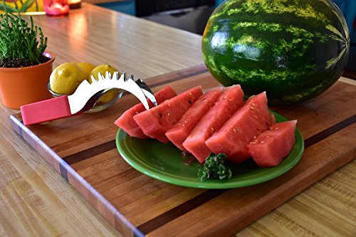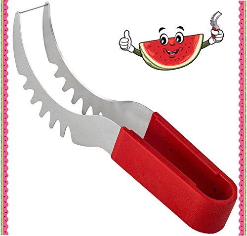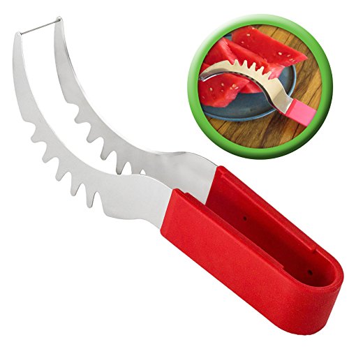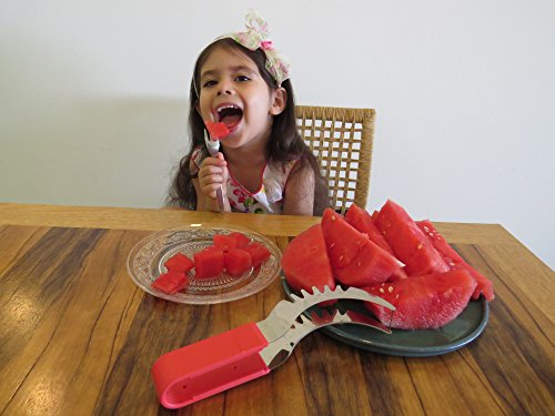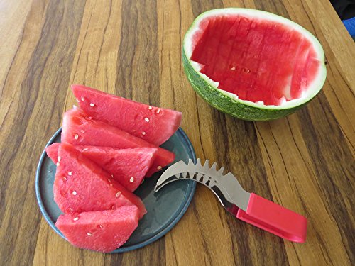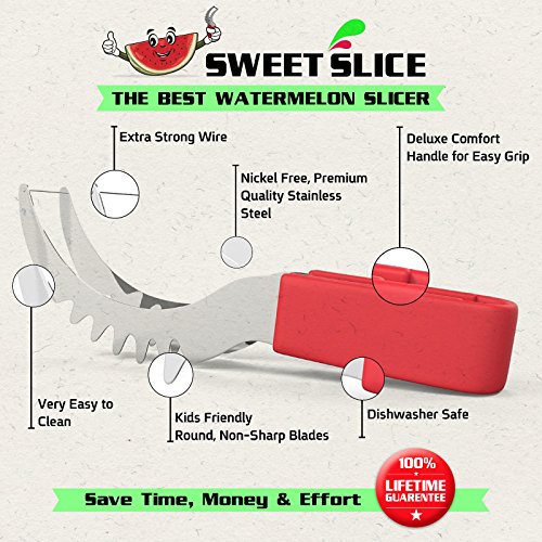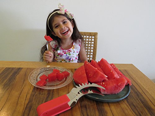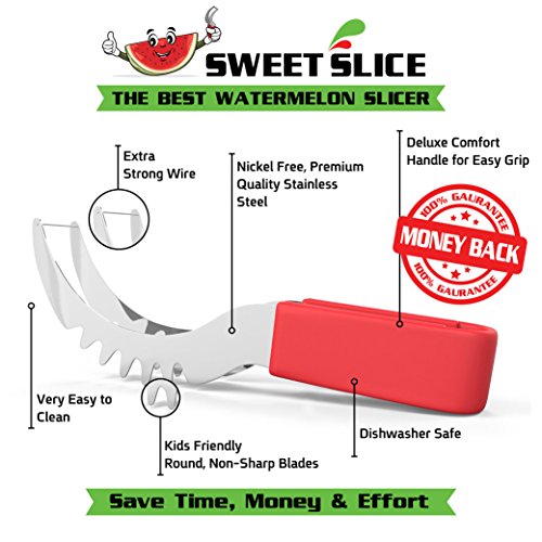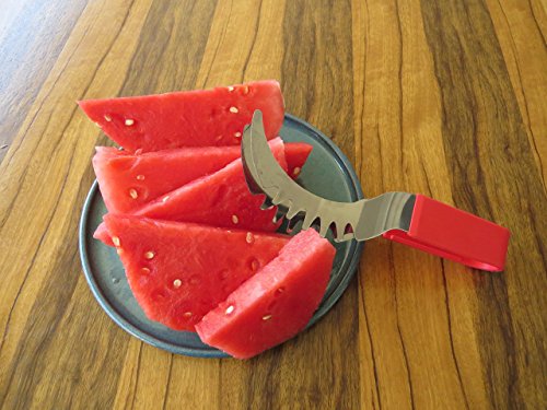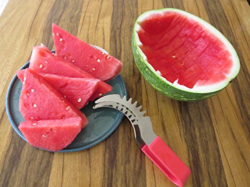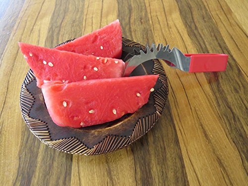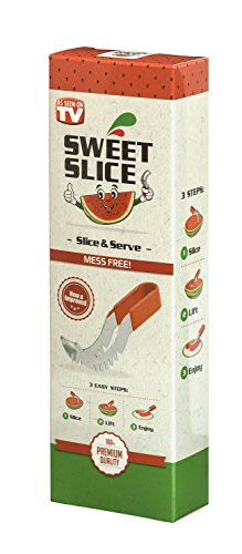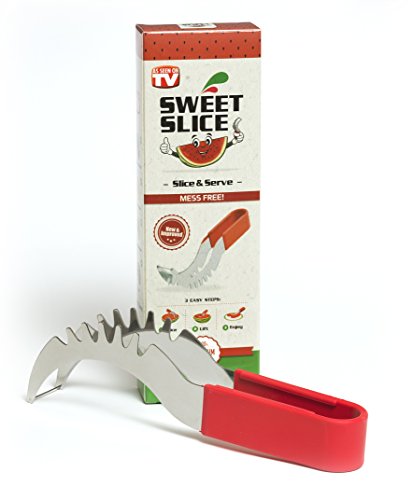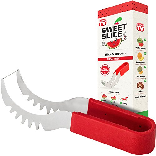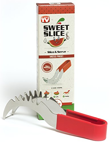 YOUR SEARCH FOR THE PERFECT WATERMELON SLICER IS OVER! Have you always wished there was a better way to cut watermelon without the huge mess after serving slices of watermelon? Then the Sweet-Slice Slicer IS THE PERFECT PRODUCT FOR YOU! Improved Product Wanting to offer the best available slicer, we reviewed comments made by consumers on similar products. We then went ahead and created the best watermelon slicer made from healthier stainless steel than any other product available on the market. However, we didn't stop there! Many common complaints about other products were about the knife handle hurting or even cutting the hands. So we crafted the Sweet-Slice® watermelon slicer with the PREMIUM ERGONOMIC plastic handle, which is easy to hold, and in addition it is also dishwasher safe. DIRECTIONS FOR USE ? CUT - Cut your Watermelon in half ? INSERT - Insert your Sweet-Slice Slicer into the Watermelon as close to the rind as possible. ? SLICE - Push the Sweet-Slice Slicer down and, following the natural inner curve of the Watermelon, pull the Sweet-Slice Slicer back towards you finishing at the opposite side of the Watermelon. Repeat this step until all of the Watermelon flesh has been sliced. ? FLIP GRAB - Flip your Sweet-Slice Slicer over and use it as a pair of tongs. Using the Slices you have just cut as a guide, Insert your Sweet-Slice Slicer and squeeze the Sweet-Slice Slicer tongs together and using a 'down and back' motion, lift out the Watermelon Slices. ? SERVE - Simply Serve and Enjoy. Perfect for any outdoor activity - BBQs, Camping, Birthday Party Cake, Mother's or Father's Day and the perfect gift for any family member or friend. Our guarantee With the Sweet-Slice 100% LIFETIME MONEY BACK GUARANTEE YOU HAVE NOTHING TO LOSE!!! CLICK THE ADD TO CART BUTTON ABOVE and join other satisfied customers that are already enjoying the Sweet-Slice slicer. 0 |