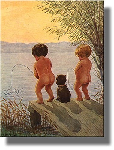 Boys By the Lake Distance Record Toilet Bathroom Picture Made on Stretched Canvas, Wall Art Decor Ready to Hang. (14" x 18")