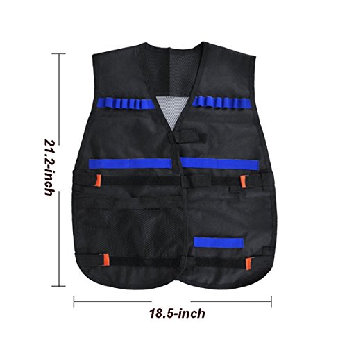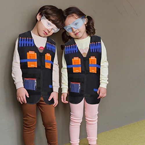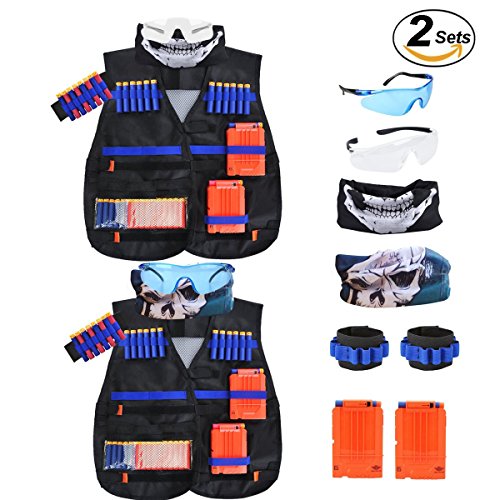 Durable Tactical Vest Kit for Safe and Worry-free Playing Exsport tactical vest kit set is made of durable and reliable materials that ensure your safety in use as well as the long lasting lifespan of these tactical vest accessories. The whole kit can be set effortlessly to fit any kid, teenager or even grown-up. When you wear it, everything stays securely in place, even the spare darts stay in place, for you to move around for exciting safe and worry-free gun fights. Package includes: 2 x Tactical Vest(size 21.26*18.5inch) 2 x Quick Reload Clips (6-darts) 2 x Hand wrist hands 2 x Vision Gear 2 x Tactical Mask