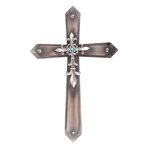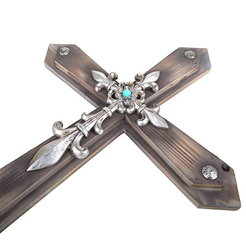 21" Western Wall Wood Cross Faux Turquoise Bead Iron Fleur De Lis