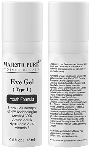 -. Binding : Misc. -. Brand : Majestic Pure -. EAN : 0684758988843 -. Feature : Majestic Pure Plant Stem Cell based EYE Cream Gel is the best anti aging Youth Formula based on natural ingredients designed for the delicate skin around your eyes to reverse the signs of aging; Helps recapture a youthful appearance. Helps fade dark circles under eyes and puffy eyes by draining excess fluids / Hydrates and Firms Skin: Eye Cream gel Keeps eye area hydrated & healthy looking; Carefully designed Eye Gel Youth formula contains a innovative combination of ingredients for most favorable results; Plant Stem Cells enhance its strength to protect against sun damage and other external factors while Hyaluronic Acid hydrates the skin and plumps it up with moisture; The Matrixyl 3000 helps to firm the skin / Innovative, potent and Best anti aging cream Formula; Great for Dark Circles under eyes, Wrinkles, and puffy eyes; From Plant Stem Cells to Multiple Complex Peptide blends, from botanically derived Hyaluronic Acid Spheres to fiber and cellular rebuilding Amino Acids, collagen boosting and skin firming and wrinkle repairing ingredients are fully loaded into this genius formula / Safe For All Skin types: Majestic Pure Eye Cream Gel is Non-comedogenic and does not contain parabens, sulfates or alcohol; It is safe to use on ALL skin types; This eye cream gel has better and faster absorbent properties; For best results use twice a day in order to restore your skin back to its natural youthful glow and reverse the signs of aging / Purchase with complete peace of mind, we are confident we have developed the absolute best anti aging Eye Gel available. If you are not completely satisfied with Majestic Pure Eye Cream Gel, we will refund your entire purchase -. MPN : 2855222 -. PackageQuantity : 1 -. PartNumber : 2855222 -. ProductGroup : Beauty -. ProductTypeName : BEAUTY -. Title : Majestic Pure Eye Gel Type I, Youth Formula, 0.5 fl. oz. -. UPC : 684758988843