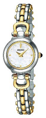 Two-tone stainless steel case and bracelet. White mother-of-pearl dial. Black cabochon crown. Hardlex crystal. Jewelry clasp. Case diameter 19mm. Quartz movement. Water resistant at 30 meters (100 feet). Seiko Dress Ladies Watch SUJD41Feature