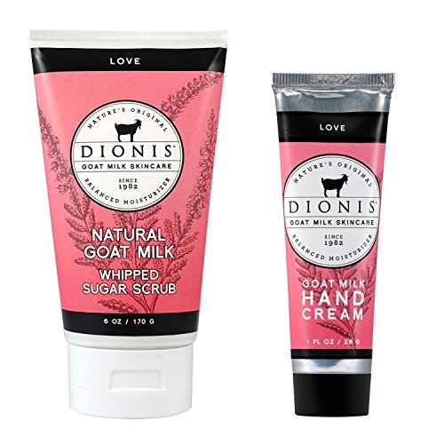 Dionis Goat Milk skincare set that includes one 6-ounce Sugar Scrub and one 1-ounce hand cream in "Love" scent.