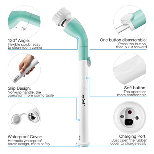 - PORTABLE CORDLESS DESIGN: Powered by built-in rechargeable 1300mAH battery, the cordless spin scrubber can last continuously up to 20 minutes . The 360 degree high rotate speed meets your need of long working duration to clean and wipe the dirt thoroughly without interruption.