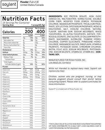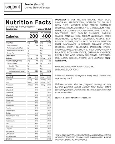 -. Binding : Health and Beauty -. Brand : Soylent -. Feature : Get all of the essential nutrients required to fuel the human body / Not intended to replace every meal, but it can replace any meal / Has a smooth flavor that is delicious on its own and blends easily with fruits, vegetables, and other add-ins. / Each Powder Tub contains twelve 400 kcal meals, or twenty four 200 kcal snacks / Includes: 1 Soylent Powder Tub 1.04kg (2.3 lbs) -. IsAdultProduct : 0 -. Label : Soylent -. Manufacturer : Soylent -. MPN : Soylent -. PartNumber : Soylent -. ProductGroup : Health and Beauty -. ProductTypeName : HEALTH_PERSONAL_CARE -. Publisher : Soylent -. Studio : Soylent -. Title : Soylent Powder Tub Nutritional Meal Replacement 1.04 kg