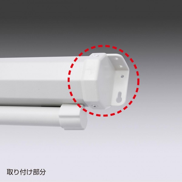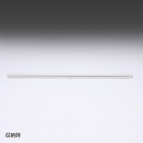 | 90型相当の吊り下げ式プロジェクタースクリーンです。付属の金具などを使って天井や壁に固定できます。スクリーンを引き出すと任意の位置で固定できます。収納時はゆっくり引き込む、スロー巻き上げタイプです。 |