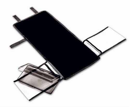 Made of sturdy, moisture-resistant material, the three-in-one Fold & Go changing kit is the perfect changing pad for parents on the go. The foldout pockets on either side hold two to three diapers, and it has a reusable transparent case for wipes and other baby essentials. The kit can be folded up and ready to go with its carry handle, or--because it's compact in size--be placed in a diaper bag.