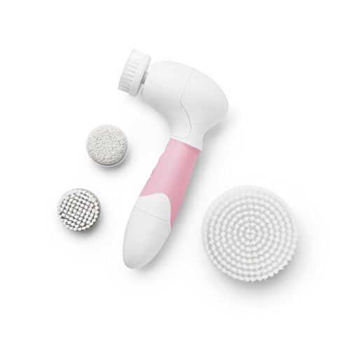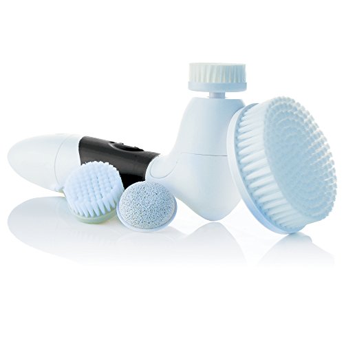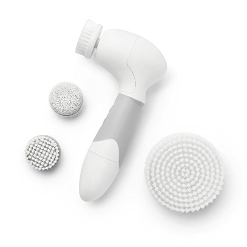 The Vanity Planet Spin for Perfect Skin Face & Body Cleansing Brush has a brush head to meet just about every need: the Facial Cleansing Brush Head has ultra-soft nylon bristles for daily use and is perfect for all skin types, including sensitive; the Exfoliating Facial Brush Head, which should only be used once a week, has synthetic bristles that sweep away dead skin cells and helps the new, healthy skin underneath better absorb serums and moisturizers; the Pumice Stone attachment can be used to smooth heels, knees, and elbows, but never the delicate face area; and the large Body Brush head has nylon bristles and can be used with your favorite shower gel or body scrub to cleanse and exfoliate large or hard-to-reach areas like the arms, legs, torso, and back.
