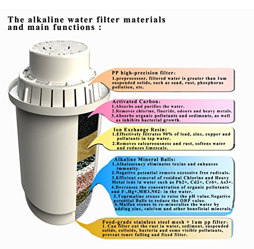 -. Feature : ALKALINE IONIZED WATER IMPROVES YOUR HEALTH & WELLNESS - REMOVE TOXINS, BOOST ENERGY & HYDRATION LEVELS - powerful antioxidants and minerals remove heavy metals, chlorine & chemicals by filtering through our unique 7-stage filtering system. / REMOVE TOXINS (Heavy Metals, Fluoride, Chlorine, Chloramide etc) & ADDS IN ESSENTIAL MINERALS (iron, zinc, calcium and other beneficial minerals) - powerful antioxidant & high negative ORP (Oxidation-Reduction Potential - a measure of the cleanliness of the water & its ability to break down contaminants. Most bottled and tap water has a positive potential, while alkaline with its negative potential donates extra electrons to neutralize the harmful effects of free radicals on the body). / BEST & HIGHEST ALKALINE LEVELS MEASURED of all pitchers tested on the market. / PREMIUM ECO FRIENDLY MATERIALS - BPA free and food grade AS & ABS quality, CERTIFIED by SGS, NSF, Member of The Water Quality Association. / INCLUDES 3 EXTRA LONG LIFE FILTERS - Using Alkaline Water Pitchers Saves Money & the Planet by eliminating 8300 bottles.