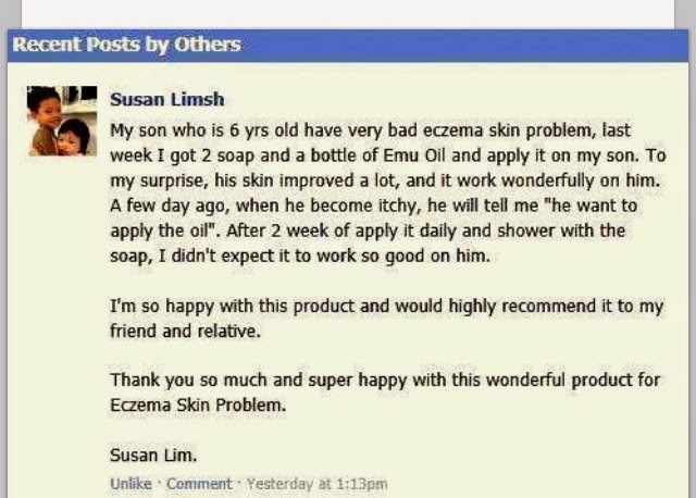 Pictures below are provided by the aunty of a Bruneian boy who had eczema on his feet. Condition improved after 6 weeks of application. His aunty who has chronic chapped lip used to experienced tearing at the two ends of her lips. After using emu oil as a lip balm, her lips has also recovered.