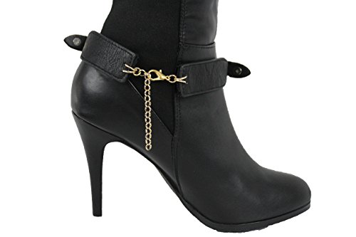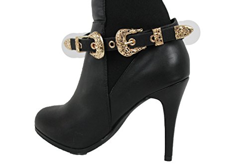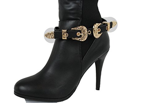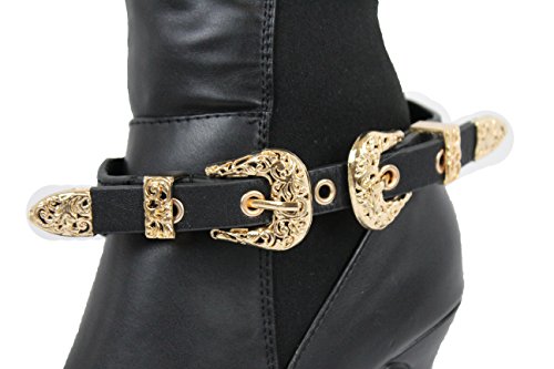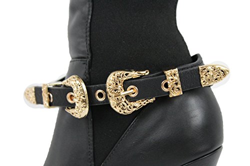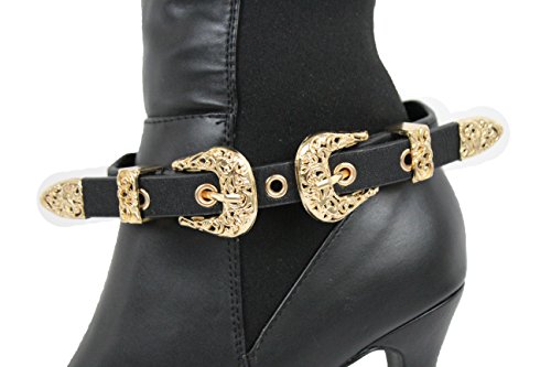 -. Title : TFJ Women Boot Bracelet Western Gold Metal Double Belt Buckles Charm Black Strap Faux Leather