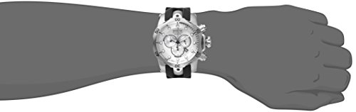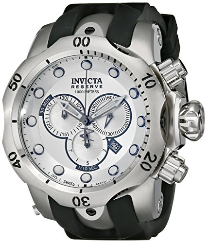 -. Feature : Precise Swiss-quartz movement / Flame-fusion crystal; brushed and polished stainless steel case; black rubber strap / Chronograph functions with 60 second. 30 minute and 1/10 of a second sub dials; date function / Silver dial with luminous hands and hour markers; silver-tone unidirectional bezel; screw down crown and pushers / Invicta Reserve 5-Year Warranty Included with Shipment