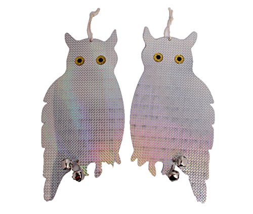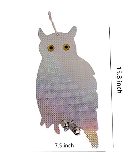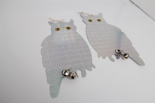 - Hanging owl with bells on produce sound deterrent for animals not only scared by light