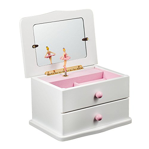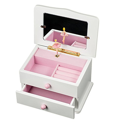 White Wooden Musical Jewelry Box with Drawer Twirling Ballerina to "Magic Flute" Melody