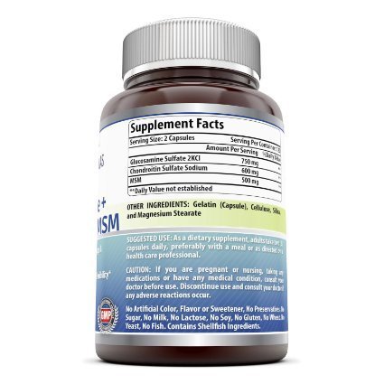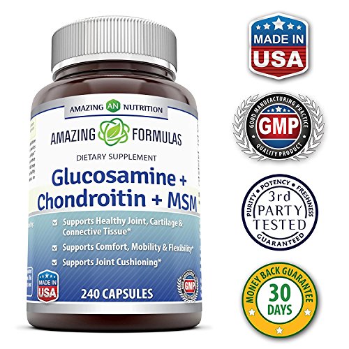 Studio : Amazing Formulas Publisher : Amazing Formulas Binding : Health and Beauty Product Description Our joints are naturally lined with a protective substance called cartilage that provides insulation to keep bones from rubbing as they bend. This cartilage breaks down with age, resulting in pain, stiffness and inflammation.? Studies suggest that increasing the body's supply of certain nutrients that are naturally present in the joints can provide arthritis relief and promote healthier joints with age. The three of the nutrients that have been studied the most and shown to have the greatest potential for benefits are:? * GLUCOSAMINE, is used by the body to build cartilage. There are many types that have been studied, but glucosamine hydrochloride (HCl) has been shown to be the most concentrated form.? * CHONDROITIN, is a component of healthy cartilage. Chondroitin sulfate is the form that has been researched the most by scientists.? * MSM, supports the production of glutathione, an important kind of antioxidant to fight off free radicals. It also helps to produce collagen and keratin, which are essential for healthy hair, skin and nails.? Studies suggest that a glucosamine chondroitin MSM complex, a formula that provides both the nutrients is more effective for joint health.? Amazing Nutrition proptitaryformual of Glucosamine Chondroitin MSM makes it easy for you to benefit from the best forms of glucosamine chondroitin. Our supplement provides an optimal dose of each substance in its best form.? Not a messy glucosamine chondroitin MSM powder or liquid, Amazing Nutrition Glucosamine Chondroitin MSM comes in an easy-to-swallow capsule. Just two capsules per day provides the glousamine chondroitin MSM dosage that is most frequently recommend by helath care professionals.? Promote joint health with Amazing Nutrition proprietary Glucosamine Chondroitin MSM formula. Order today! 0