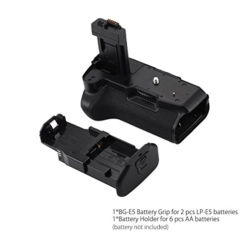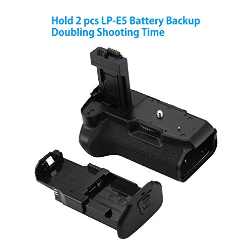 Quick release battery grip can hold 2 pcs LP-E5 or 6 pcs AA-size battery backup, doubling the battery capacity for extending more shooting time