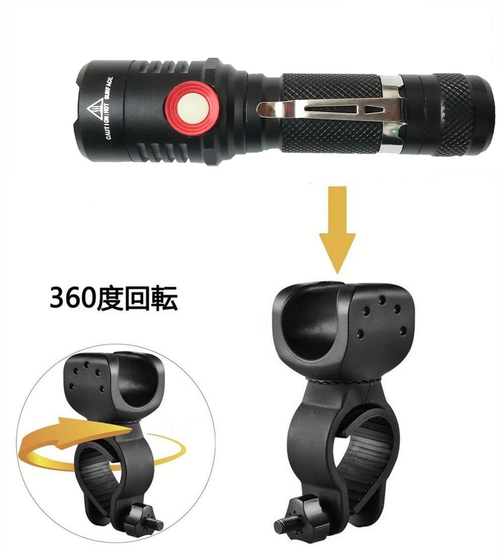 Includes: flashlight body, Micro USB 2.0 cable, lithium ion rechargeable battery (18650), bicycle light holder, craft paper storage case