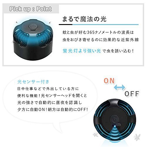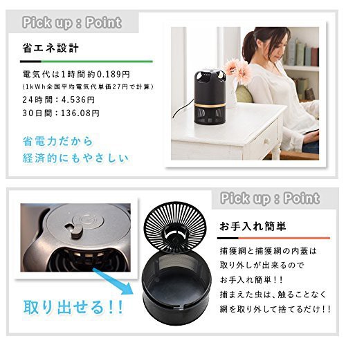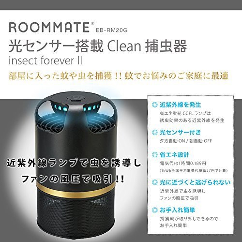 | 商品説明 | 「ROOMMATE(R) 光センサー搭載 Clean 捕虫器 insect forever II EB-RM20G」は、部屋に入った蚊や虫を近紫外線で誘導し、ファンの風圧で吸引し捕獲網に取り込みます。 蚊や虫は風の力に押された状態になり、 体力を消耗させると同時に乾燥させながら駆除。 殺虫剤などは使用しないため、 身体にやさしくクリーンに使用でき、小さな赤ちゃんやペットを飼っているご家庭にもおすすめです。 コンパクトサイズなので机やテーブルなどに置いても邪魔になりません。 【品番/カラー】 EB-RM20G / ブラック 【サイズ】 約W130×D130×H212mm 【重量】 0.48kg 【材質】 ABS樹脂 【コード長】 1.8m 【波長】 365nm±5nm 【定格入力】 AC100~240V(50/60Hz) 【定格出力】 DC12 1000mA 【消費電力】 7W 【保証】 1年間 【付属品】 ACアダプター、取扱説明書 【生産国】 中国 【JAN】 4560481899402 |