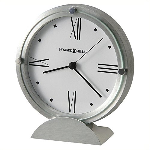 The Simon II Table Clock by Howard Miller is a brushed-aluminum clock that features a flat glass crystal accented with three polished silver-tone buttons and brushed-and polished-aluminum semi-circle base.Feature