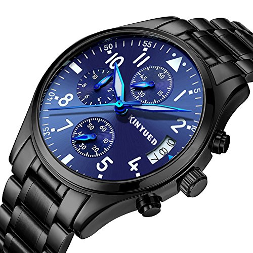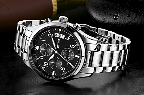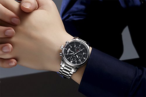 -. Feature : 重量感のあるステンレスバンド(ケースとバンド調整器付き) / ファッションな外見、ビジネス・日常生活用にも適しています / 精度の高い日本製クオーツを採用、カレンダー、クロノグラフ機能付き / バンド幅: 20 mm 長さ: 20 cm / ケース厚: 10 mm 直径: 42 mm / 3気圧防水(洗顔、小雨に濡れる程度):安心の日常生活防水仕様