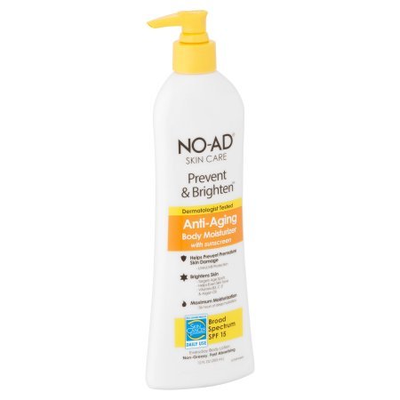 Studio : NO-AD Publisher : NO-AD Binding : Misc. Product Description While helping to prevent against Photo-Aging by providing UVA/UVB broad spectrum protection, No-Ad Prevent Brighten SPF 15 body lotion also hydrates and brightens skin for a more youthful appearance. Its unique formula combines antioxidants, Vitamins B3, C and E, and Argan Oil and is specially formulated to help diminish the appearance of age spots and brighten skin. This revolutionary product can provide up to 36 hours of moisturization while helping to even and restore you skin's natural glow. 0
