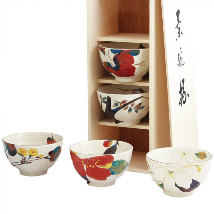 レトロな蔦、藤、つわぶき、山茶花、木蓮の5柄の飯碗揃です。大切な方へのギフトにも最適です。