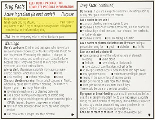 -. Feature : Pack of three, each box holds 24 count (total of 72 count) / Magnesium Salicylate. Relieves backache pain. Non-USP caplet (assay) / Caplets made in Canada / Doan's Extra Strength temporarily relieves minor backache pain / Make your day a lot easier with Doan's Extra Strength
